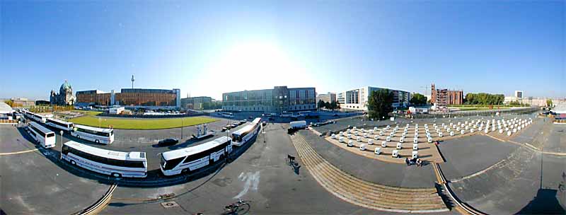 Druck eines Panoramas Auch "ausgerollt" als gedruckte Version hat ein 360° Kugelpanorama eine faszinierende optische Wirkung. Beim dargestellten Bild wurden die zu stark verzerrten Randbereiche oben und unten abgeschnitten. Die Aufnahme entstand im Sommer 2000 auf dem Schlossplatz in Berlin und zeigt die spektakuläre Aktion "weiss104", bei der 104 Waschmaschinen zur öffentlichen Benutzng aufgestellt wurden. In diesem Fall sind die Kamerastandorte in der 360° Darstellung und im Druckbild verschieden. |